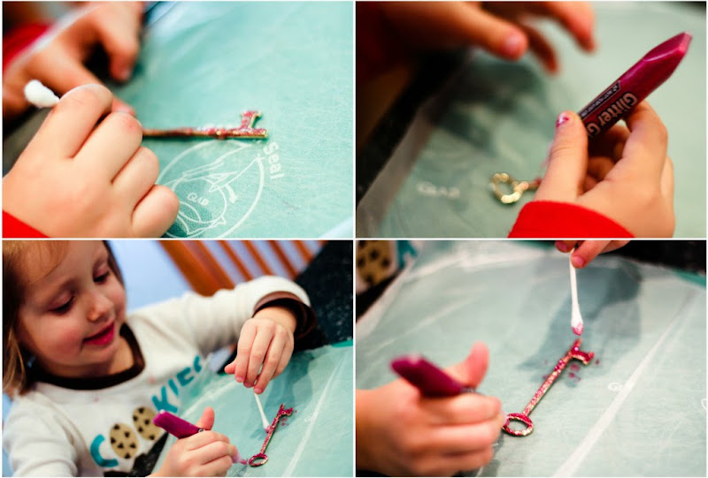 We had SO much to do to get ready for Santa to come. Here were all of our preparations! First we painted Santa's magic skeleton key. If you have never heard of this, it is a cute way to answer a major problem for some Arizona families, which is how does Santa come into our house if we have no chimney :/ So each year we get a gold key (Ace Hardware) and let the kids decorate it with paint and glitter. Then we tie a ribbon and a cute note and hang it on the front door with a ribbon. Ella painted one side of it...